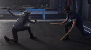 - Les anciens Titans vont sur une piste au stade, seul endroit de la ville avec de la lumière. Mais alors qu'ils s'attendait à la surprise numérique. Light était au courant et les bat. Il arrive à fuir car Dick protège avant tout un bus de civiles. Jason qui voulait aller en mission prend mal qu'ils ait échoué, et tente de s'en prendre à Dick qui le met au sol.